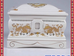 我公司生产的陶瓷殡葬用品陶瓷骨灰盒,不但适应土葬,而且还适应存放。它最大的特点不象其他产品是组合粘接而成,而是一个完整的整体。它耐酸,耐腐,耐氧化,不怕虫蛀,不怕鼠咬,百年出土后颜色不变,仍象新瓷一样。让逝者安睡在九泉之下,不用担心骨灰盒会烂,而且品种齐全,款式庄重大方。能满足社会各阶层,各民族习俗的需要。所以说:从长远观点来看,高温颜色釉陶瓷骨灰盒是丧家的最佳选择,而且是殡葬领域今后发展的方向。
